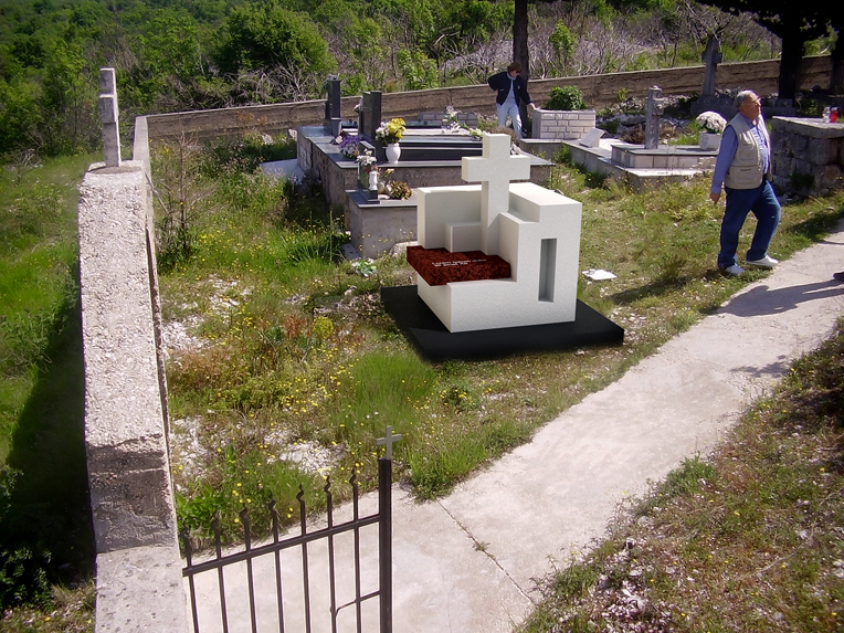 Sama postavka – mjesto spomen obilježja je u postojećem rasteru groblja. Mjerilo spomen obilježja prilagođeno je postojećim volumenima.